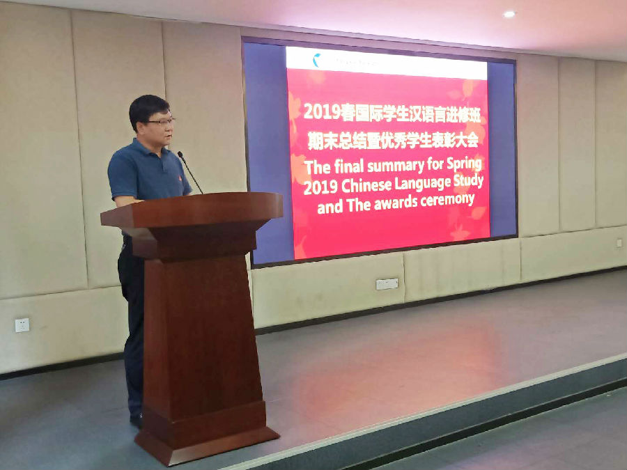 李先书记在会上对2019春季班进行了总结:来自28个国家的60名国际学生,虽然文化背景、种族、宗教信仰不同,但是来我们学校的目的是一致的,都是想通过学习提高自己的汉语水平,在过去的一个学期总体情况较好,能够遵守中国的法律法规和学校的规章制度,在文艺汇演中表现了较强的文艺水平和较高的团队精神,体现了班集体的凝聚力。公司总监苏耀桦向学生介绍了HSK考试报名的注意事项及报名流程。班主任向学生布置了2019暑假放假及2019秋报到注册的相关工作。国际交流学院黄亚武老师向学生介绍了我校2019/2020学年国际学生的学历招生计划,鼓励已经完成汉语学习的国际学生积极报读。