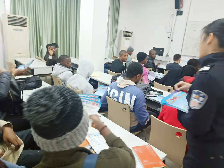2019年12月6日上午,广州市公安局海珠区新港派出所徐警官一行6人,来我校继续教育学院对2019秋汉语言进修班的国际学生进行了“防诈骗”宣讲,宣讲活动在继续教育学院101课室举行。