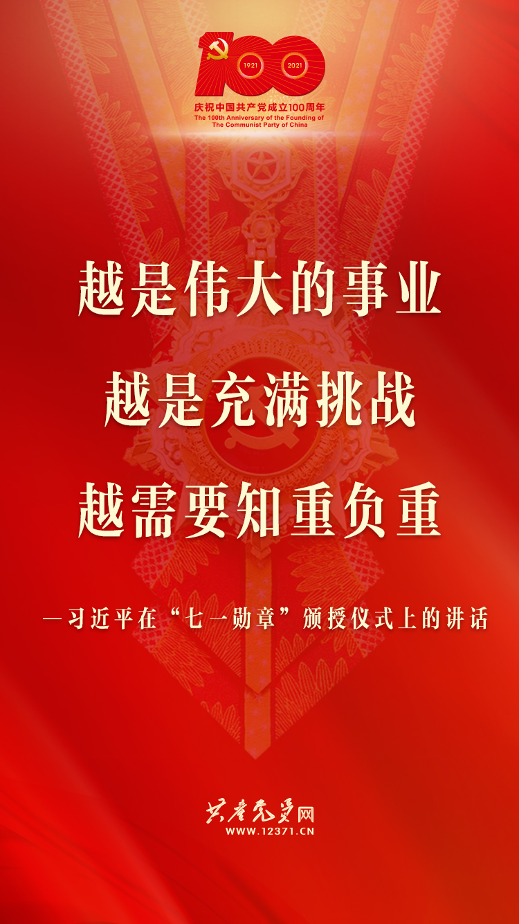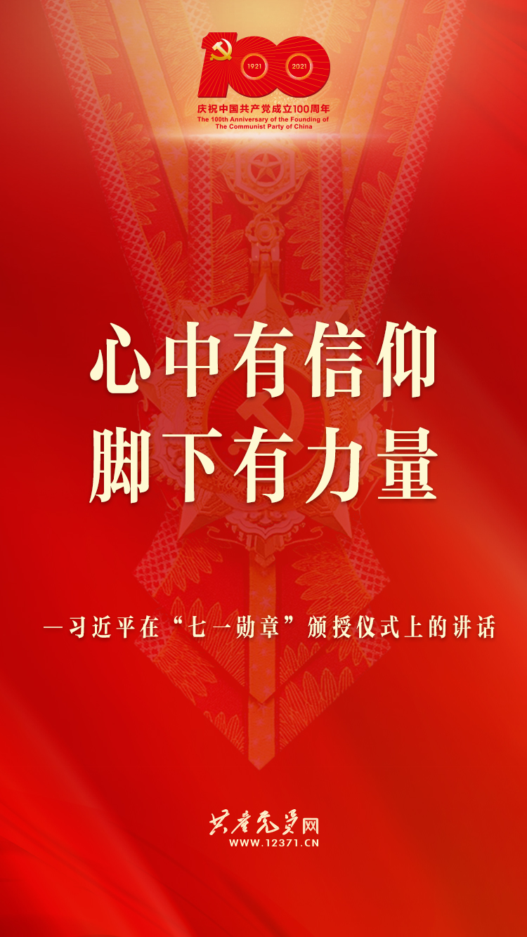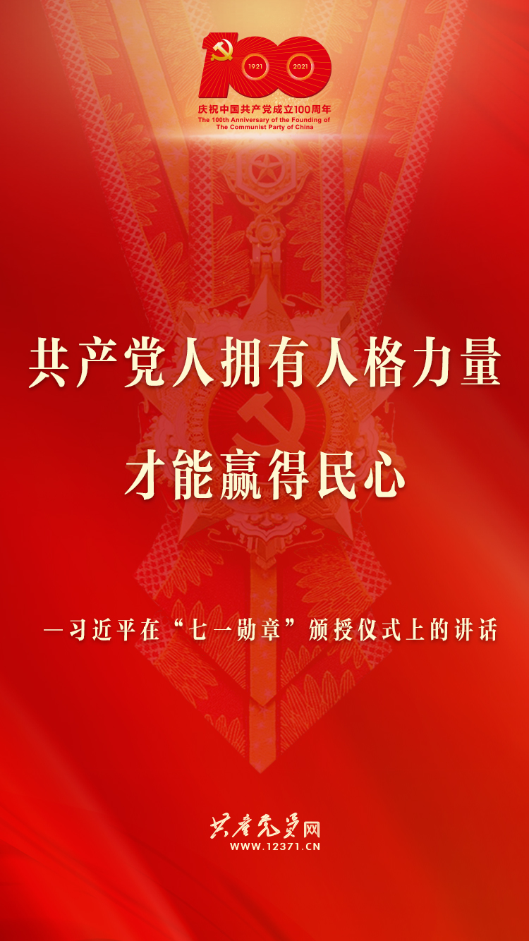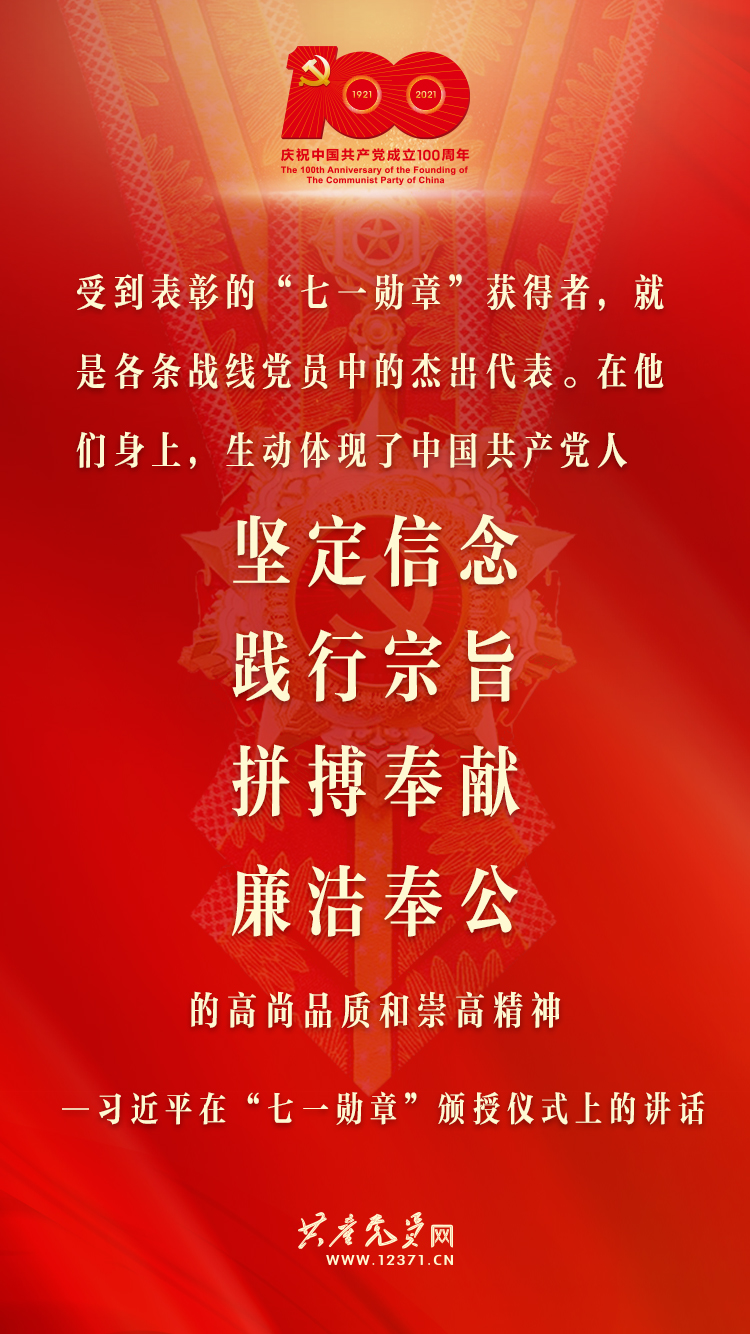 6月29日,中共中央总书记、国家主席、中央军委主席习近平在庆祝中国共产党成立100周年“七一勋章”颁授仪式上发表重要讲话。习近平说,今天受到表彰的“七一勋章”获得者,就是各条战线党员中的杰出代表。在他们身上,生动体现了中国共产党人坚定信念、践行宗旨、拼搏奉献、廉洁奉公的高尚品质和崇高精神。