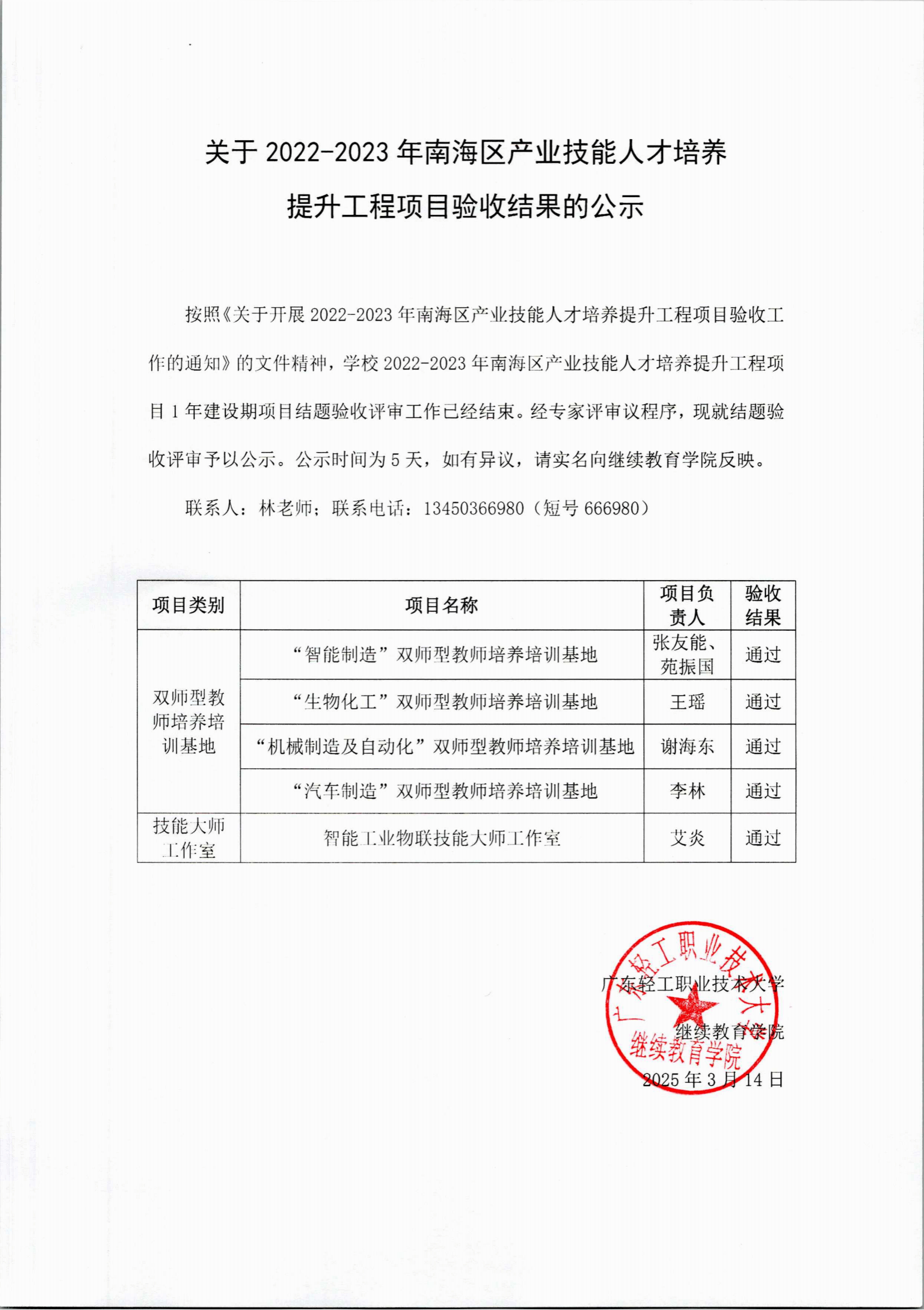 关于2022-2023年南海区产业技能人才培养提升工程项目验收结果的公示