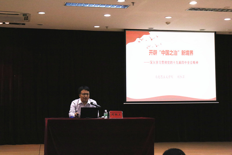 马克思主义学院刘红卫博士为各二级学院500多名学生代表进行了《开辟“中国之治”新境界——深入学习十九届四中全会精神》宣讲,围绕中国共产党第十九届中央委员会第四次全体会议的重要内容展开。刘老师首先对会议精神做了提纲挈领式的阐述,从会议总体情况、三个重要文件、十三个显著优势、一个总体目标、十三个坚持和完善等几个方面进行了解读。对“经济快速发展的奇迹”和“社会长期稳定奇迹”进行了数字化的分析和论证,围绕5000年、500年、170年、100年、70年几个时间节点来阐释了“中国之治”与“西方之乱”的制度原因,并结合时政联系实际对同学们感兴趣的“世界百年未有之大变局”“国家治理体系和治理能力”等关键词进行重点阐释。刘老师指出,中国共产党第十九届中央委员会第四次全体会议具有里程碑意义,必将开辟新时代“中国之治”的新境界,是对未来三十年怎么治理国家、怎么实现中华民族伟大复兴梦的集中回答,与青年一代的个人发展和职业前途息息相关。