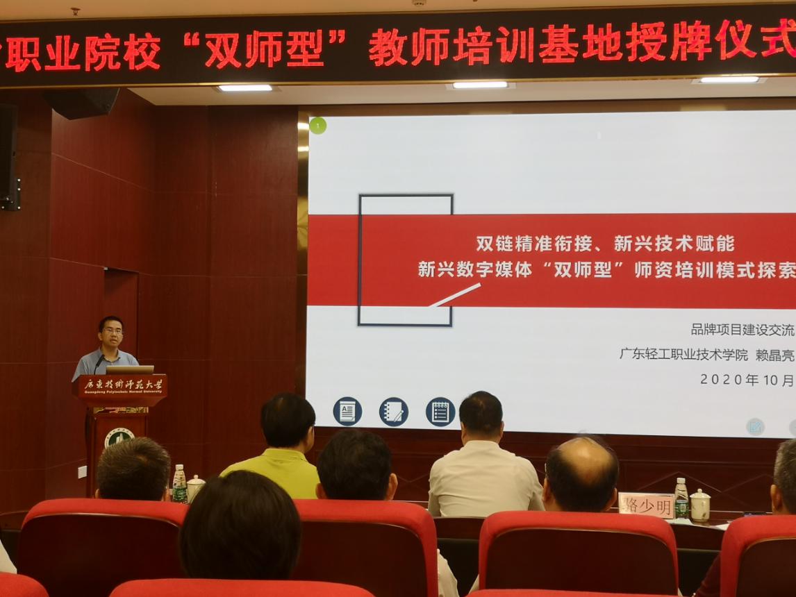 交流会上,学校的广东省“一基地一品牌”建设项目“双链精准衔接、新兴技术赋能,新兴数字媒体‘双师型’师资培训模式探索”,由项目负责人、信息技术学院赖晶亮老师作经验交流汇报,得到了与会领导、各兄弟院校的一致好评。