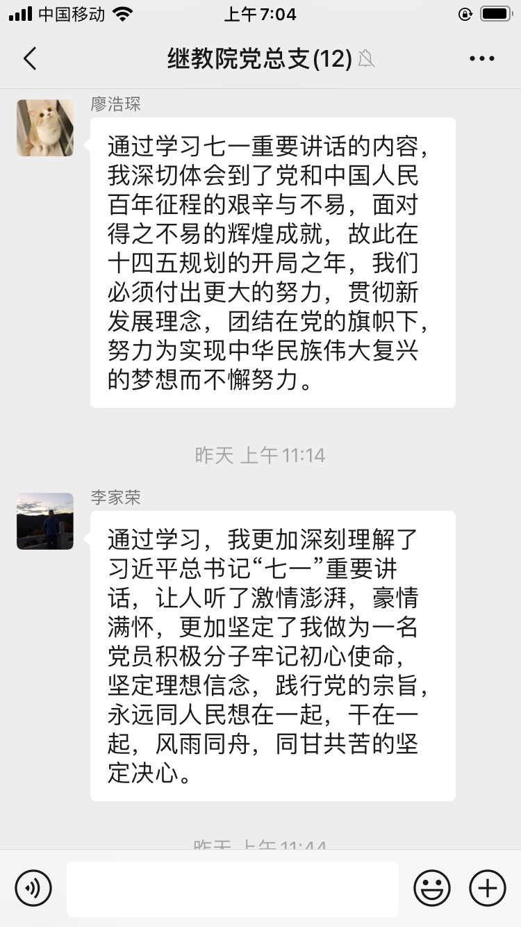 二、继续教育学院党支部的全体党员在党总支微信工作群交流学习习近平总书记“七一”重要讲话并发表心得体会。