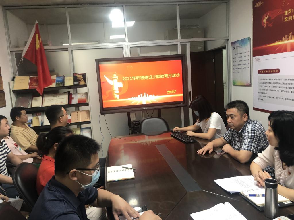 为深入学习贯彻习近平总书记在庆祝中国共产党成立100 周年大会上重要讲话精神,深入贯彻落实党中央、国务院和省委、省政府关于全面深化新时代教师队伍建设改革工作的决策部署,进一步加强和改进新时代师德师风建设,大力提升教师职业道德素养, 9月2日下午,继续教育学院党总支开展2021年师德建设主题教育月活动,深入学习贯彻习近平总书记关于教育的重要论述和《新时代高校教师职业行为十项准则》,学院院长陆英杰、党总支副书记张佩宜以及全体教职工参加会议。