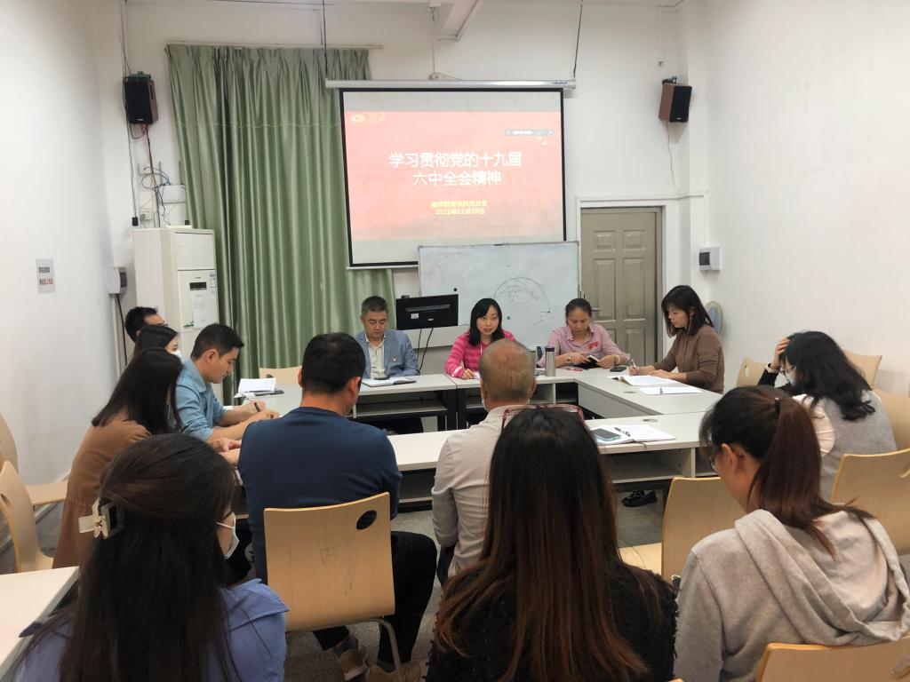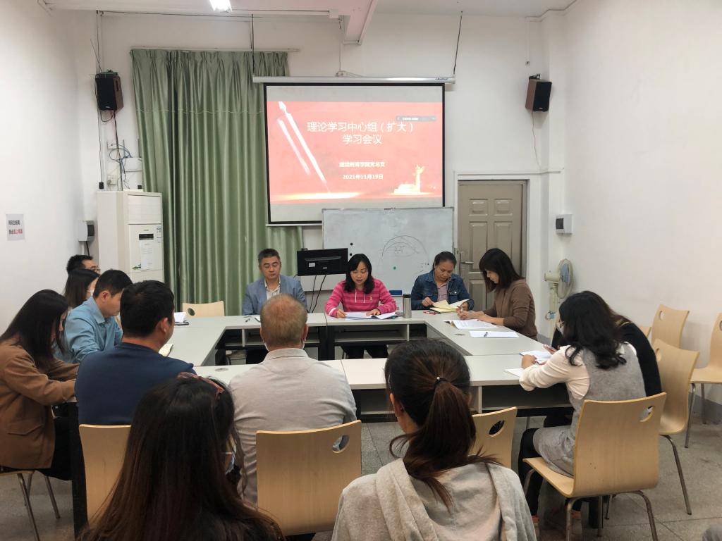 11月19日下午,继续教育学院党总支在学院103课室召开理论学习中心组(扩大)学习会议,学习《中国共产党第十九届中央委员会第六次全体会议公报》精神(以下简称《公报》)。会议由党总支副书记张佩宜主持,继续教育学院、总务后勤部全体教职工通过线上、线下方式参加会议。