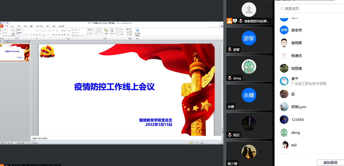 3月15日,继续教育学院党总支召开疫情防控工作线上会议。党总支副书记张佩宜主持会议,继续教育学院、资产公司、总务后勤部全体教职工线上参加会议。