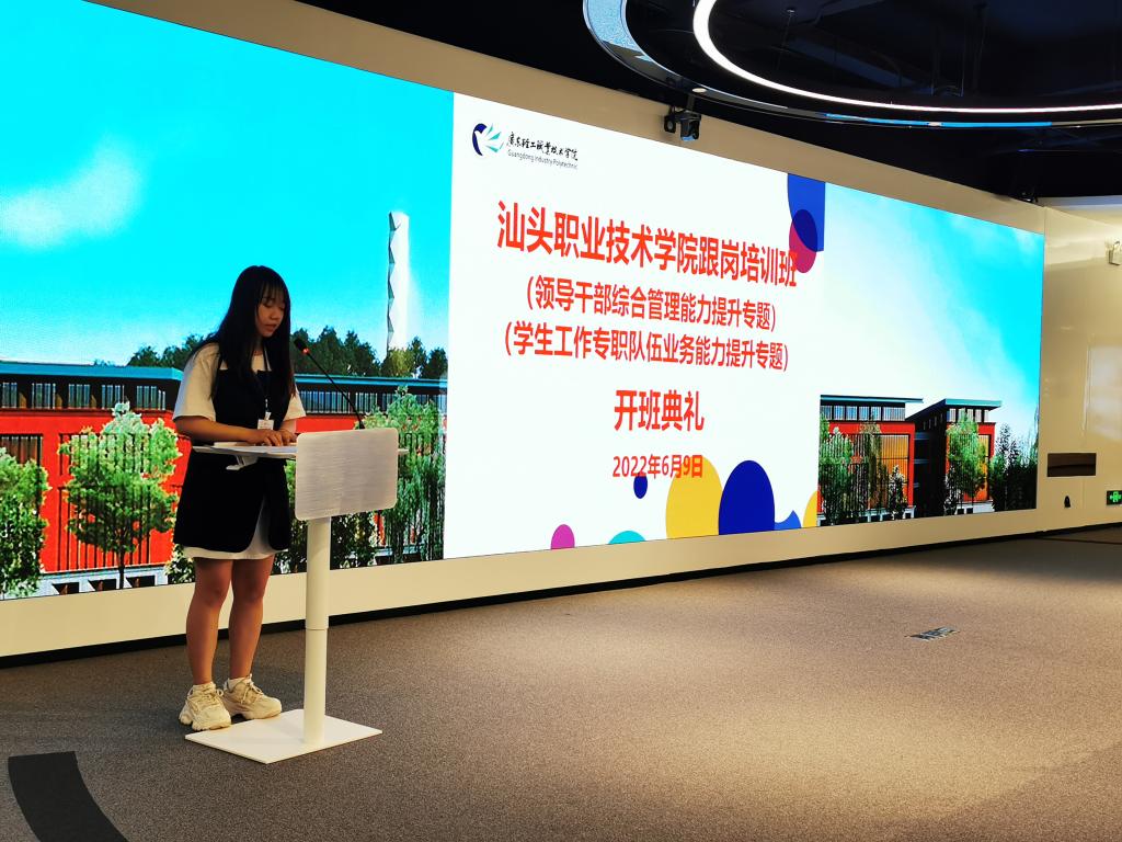 汕头职业技术学院跟岗培训班的两个专题项目在2022年6月8日成功开班,并于6月9日上午在广州新港校区第二实训楼2楼多功能展示中心举办了开班典礼。学校党委办公室主任黄华、人事处处长石朝阳、继续教育学院院长陆英杰、各对接部门负责人、培训班工作人员以及全体参训学员参加了典礼。