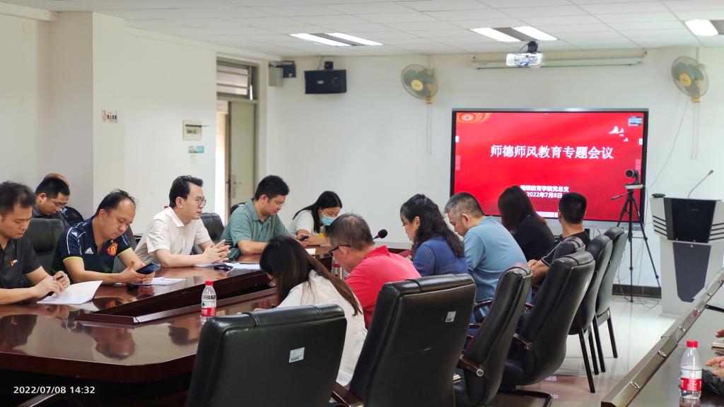 7月8日,继续教育学院党总支在佛山南海北校区行政楼2221会议室召开师德师风专题会议。