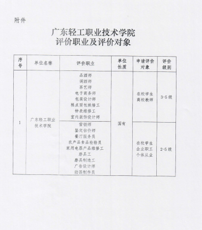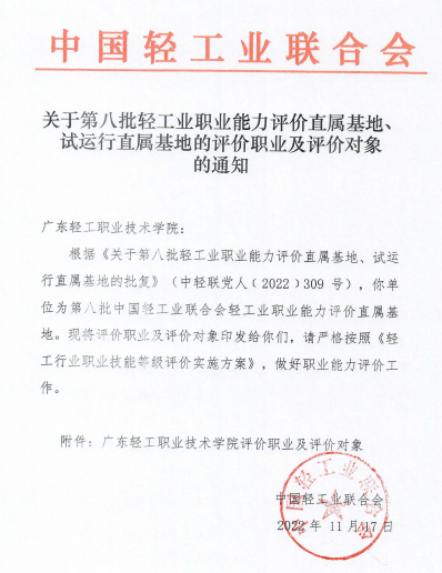 中国轻工业联合会是人社部批准的权威第三方评价机构,是人社部委托编制国家职业标准的组织单位。多年来,中国轻工联高度重视职业技能评价工作,累计鉴定工种144个、近50万人。2021年,人社部批准中国轻工业联合会为第三方评价机构,试点开展14个轻工特色工种的评价工作。同时批准将轻工144个职业列入国家目录。根据【中轻联党人〔2022〕309号】文件批复,广东轻工职业技术学院直属基地将开展品酒师、调酒师、茶艺师、电子商务师、包装设计师、糕点面包烘焙工、钟表维修工、室内装饰设计师、营销师、鉴定评估师、餐厅服务员、农产品食品检验员、家用电器产品维修工、磨具工、磨具制造工、广告设计师、动画制作员等17个职业工种的评价工作。