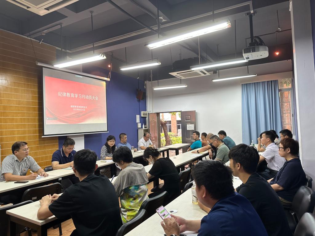 8月31日,继续教育学院党总支在学院102课室组织党总支全体教职工召开纪律教育学习月动员大会。学院党总支书记张佩宜主持会议。