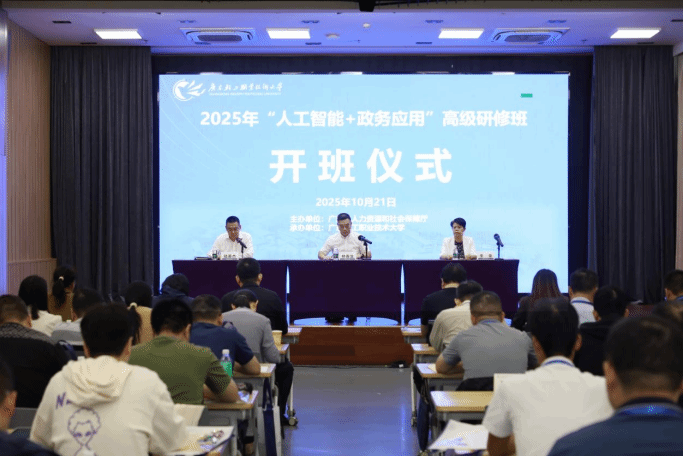 本次研修班于10月21日上午在新港校区第二实训楼商演中心正式启动。在开班仪式上,我校党委常委、副校长李荣代表学校致辞,强调了人工智能在提升政务服务质量与治理效能方面的重要作用。广东省人力资源和社会保障厅政务服务中心主任林春生在讲话中指出,本次培训是加强全省政务信息化队伍建设、推动“数字政府”高质量发展的关键举措。