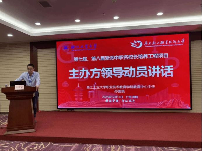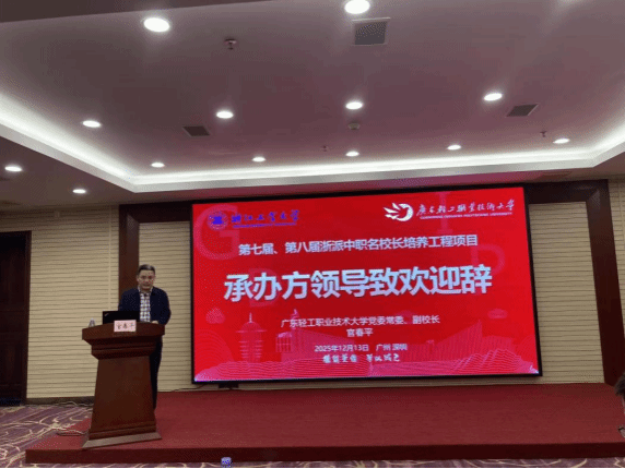 2025年12月13日上午,浙江省第七届、第八届浙派中职名校长培养工程项目培训班仪式在广州市江悦酒店顺利举行。浙江工业大学职业技术教育学院教师教育中心主任孙国良,培训班班主任陈晶晶、刘辉,我校党委常委、副校长官春平,继续教育学院院长陆英杰、副院长王瑶及全体参训书记校长共同出席。仪式由继续教育学院林亚文老师主持。