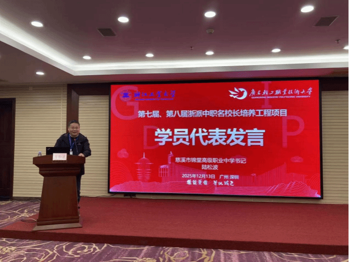 慈溪市锦堂高级职业中学党总支书记陆松波作为学员代表发言,他表示广东之行已经开启,这是一次珍贵的学习契机。让我们带着问题看,带着思考学,积极交流深入探讨。相信通过这次学习,我们每一位都能汲取养分,激发智慧,为我们各自学校的品牌建设、为浙江中职教育的高质量发展,找到更多可行的路径。